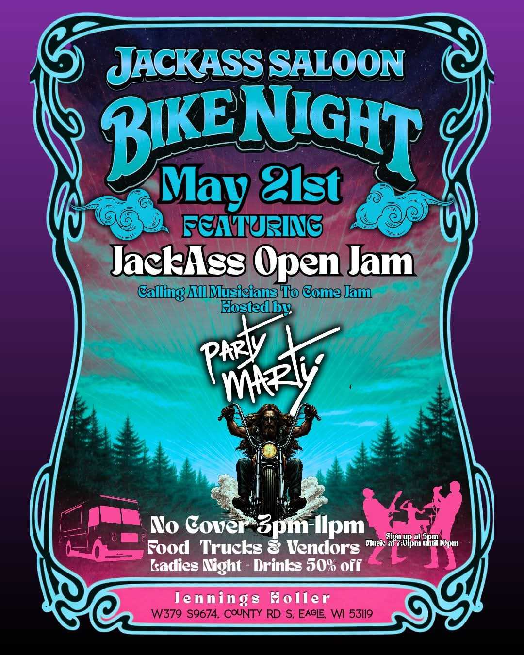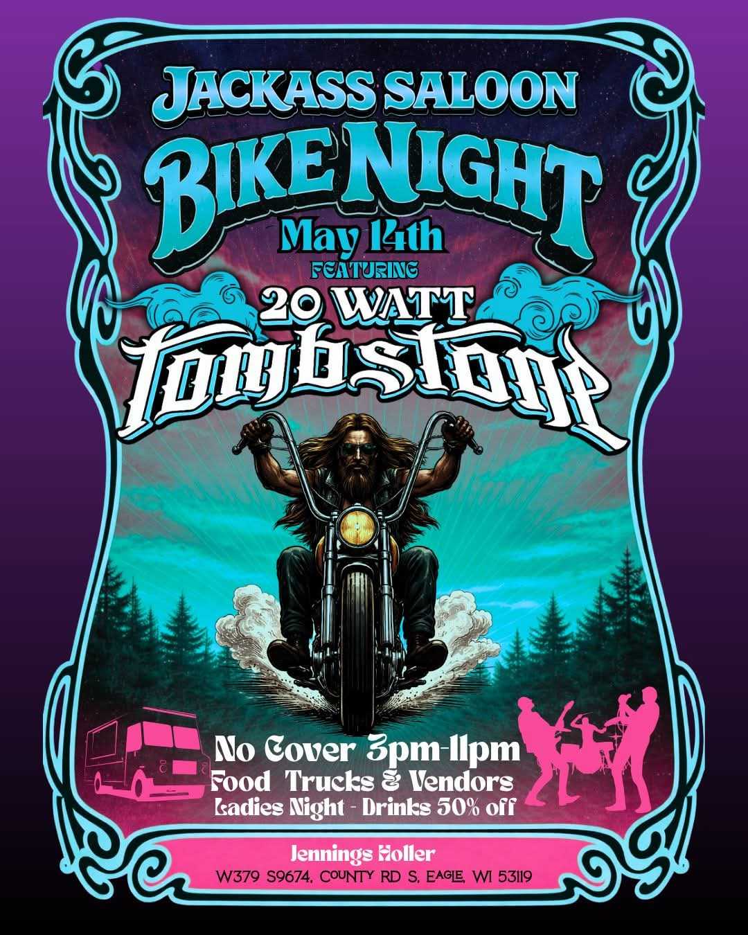 Fire up those engines and ride on over to Jennings Holler for Jackass Saloon Bike Night — kicking off with a BIG KICK-START on May 7th, 2026 and rolling on every Thursday night until September.