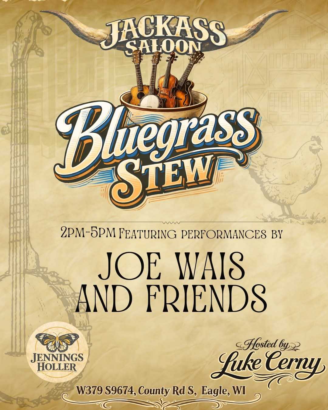 Join us April 19th from 2–5 PM at the Jennings Holler – Jackass Saloon for Bluegrass Stew Sunday, featuring the soulful STRING sounds of JOE WAIS (FROM THE MILLBILIES) & FRIENDS
