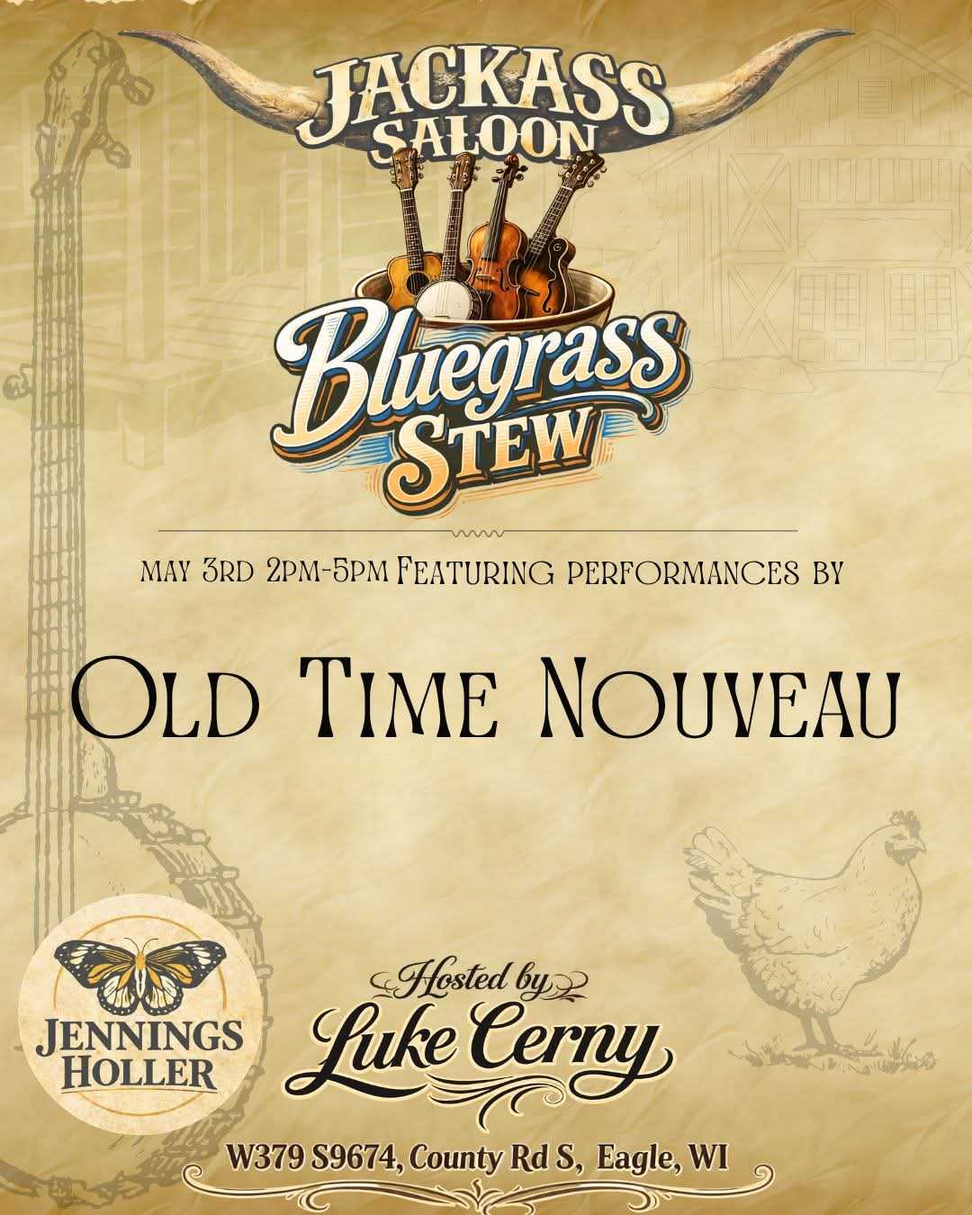 Join us April 12 from 2–5 PM at the Jennings Holler – Jackass Saloon for Bluegrass Stew Sunday, featuring the soulful sounds of Luke Cerny & friends.