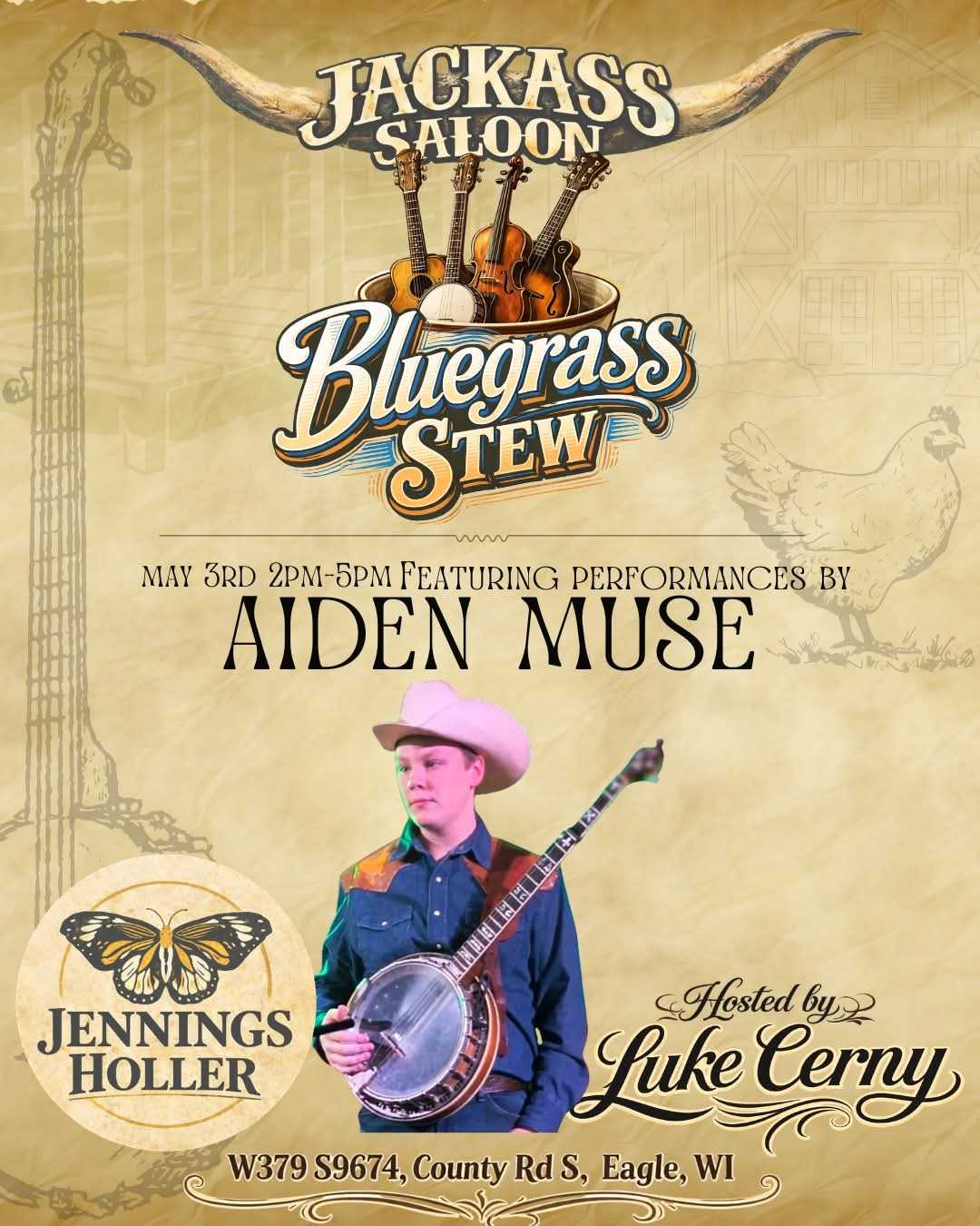 Join us May 3rd from 2–5 PM at the Jennings Holler – Jackass Saloon for Bluegrass Stew Sunday, featuring the 13 YEAR OLD Wisconsin homegrown AIDEN MUSE & FRIENDS